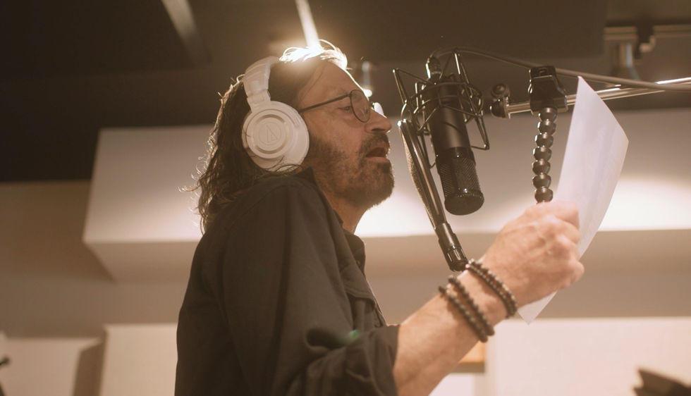 Capture the essence of music creation in a professional studio setting, featuring artists recording, wearing headphones, and playing acoustic guitar.